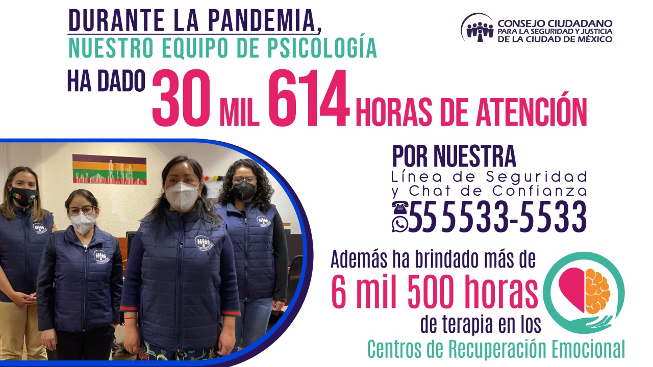 Más de 37 mil horas de ayuda emocional directa brindaron las 110 psicólogas y psicólogos del Consejo Ciudadano para la Seguridad y Justicia de la Ciudad de México, en los últimos 15 meses.