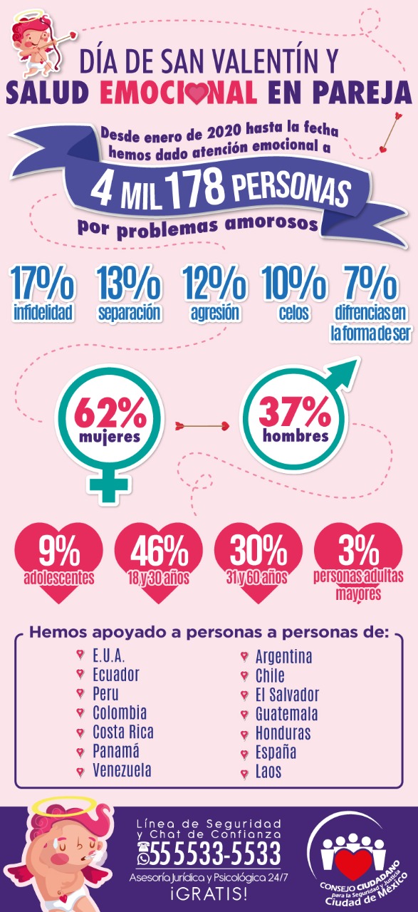 Infidelidad, rompimiento, violencia y celos son las principales problemáticas relacionadas con la pareja reportadas a la Línea de Seguridad y el Chat de Confianza 55 5533 5533.
