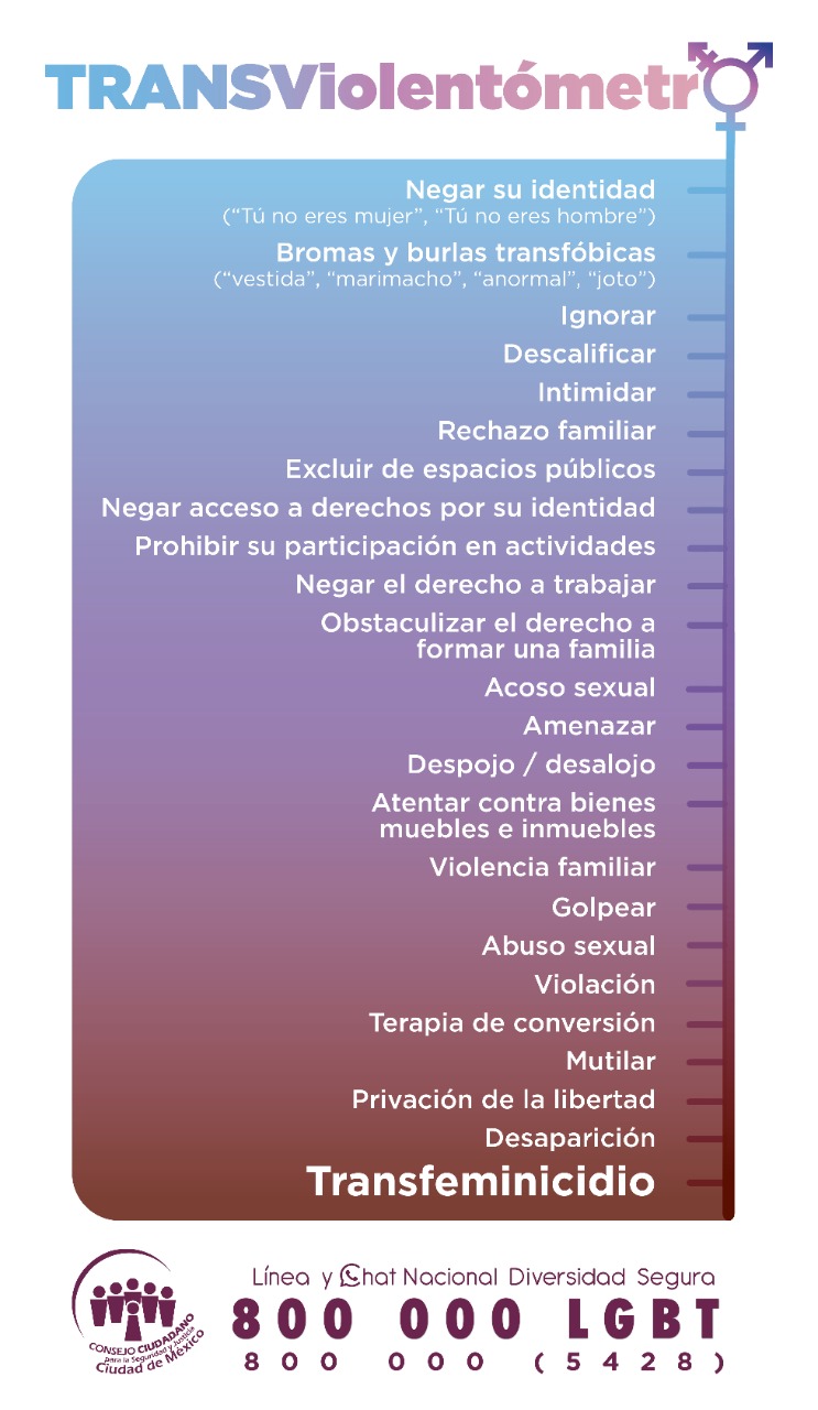 El Consejo Ciudadano para la Seguridad y Justicia de la Ciudad de México presentó el TRANSViolentómetro, una herramienta que ayuda a identificar los distintos niveles de violencia que enfrenta la población trans, desde las burlas transfóbicas hasta el transfeminicidio.