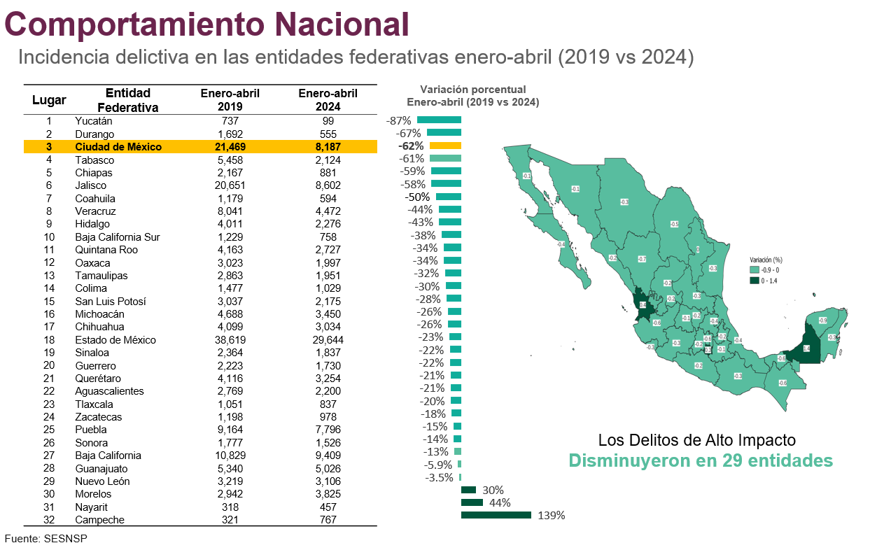 ES CDMX LA TERCERA CON MAYOR DISMINUCIÓN EN DELITOS