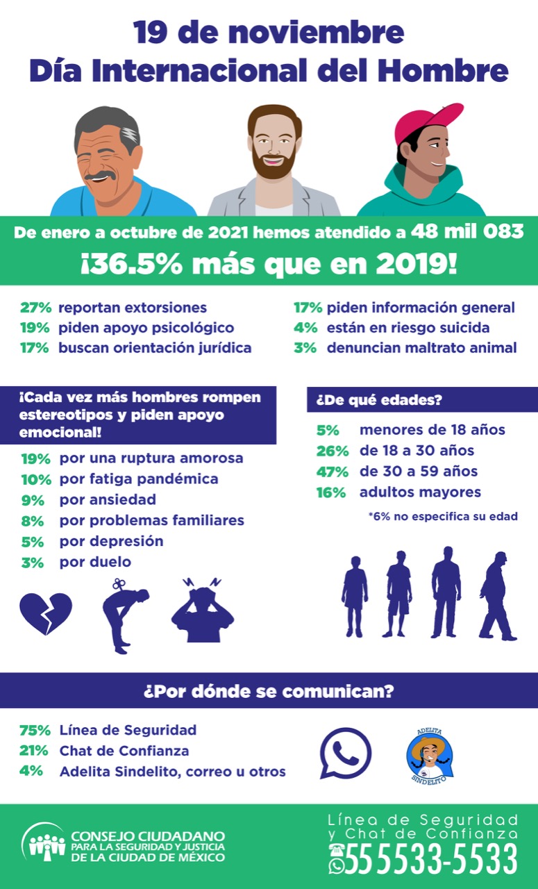 En la víspera del Día Internacional del Hombre, establecido en 1992, el organismo informó que entre enero y octubre de este año recibió 48 mil 083 reportes de varones, que representan un aumento del 36.5% en comparación con el mismo periodo de 2019.